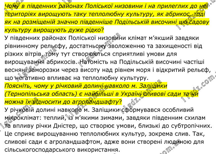 Чому в південних районах Поліської низовини і на прилеглих до неї територіях вирощують таку теплолюбну культуру, як абрикос, тоді як на розміщеній значно південніше Подільській височині цю садову культуру вирощують дуже рідко? У південних районах Поліської низовини клімат м’якший завдяки рівнинному рельєфу, достатньому зволоженню та захищеності від різких вітрів, тому тут створюються сприятливі умови для вирощування абрикосів. Натомість на Подільській височині частіші весняні заморозки через висоту над рівнем моря і відкритий рельєф, що негативно впливає на теплолюбну культуру. Поясніть, чому у річковий долині навколо м. Заліщики (Тернопільська область) є найбільші в Україні сливові сади та чи можна їх відносити до агроландшафту? У річковій долині навколо м. Заліщики сформувався особливий мікроклімат: теплий, із м’якими зимами, завдяки південним схилам та впливу річки Дністер, що створює умови, близькі до субтропічних. Це сприяє вирощуванню теплолюбних культур, зокрема слив. Так, сливові сади є агроландшафтом, адже вони створені людиною для сільськогосподарського використання.