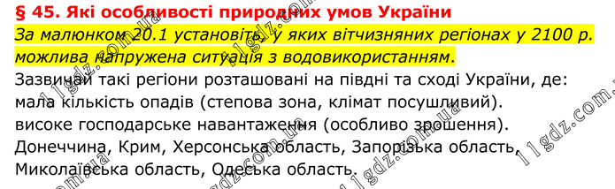 § 45. Які особливості природних умов України За малюнком 20.1 установіть, у яких вітчизняних регіонах у 2100 р. можлива напружена ситуація з водовикористанням. Зазвичай такі регіони розташовані на півдні та сході України, де: мала кількість опадів (степова зона, клімат посушливий). високе господарське навантаження (особливо зрошення). Донеччина, Крим, Херсонська область, Запорізька область, Миколаївська область, Одеська область.