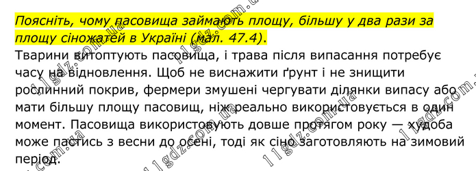 Поясніть, чому пасовища займають площу, більшу у два рази за площу сіножатей в Україні (мал. 47.4). Тварини витоптують пасовища, і трава після випасання потребує часу на відновлення. Щоб не виснажити ґрунт і не знищити рослинний покрив, фермери змушені чергувати ділянки випасу або мати більшу площу пасовищ, ніж реально використовується в один момент. Пасовища використовують довше протягом року — худоба може пастись з весни до осені, тоді як сіно заготовляють на зимовий період.
