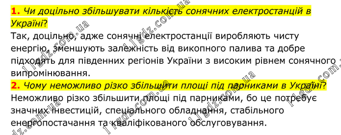 1. Чи доцільно збільшувати кількість сонячних електростанцій в Україні? Так, доцільно, адже сонячні електростанції виробляють чисту енергію, зменшують залежність від викопного палива та добре підходять для південних регіонів України з високим рівнем сонячного випромінювання. 2. Чому неможливо різко збільшити площі під парниками в Україні? Неможливо різко збільшити площі під парниками, бо це потребує значних інвестицій, спеціального обладнання, стабільного енергопостачання та кваліфікованого обслуговування.