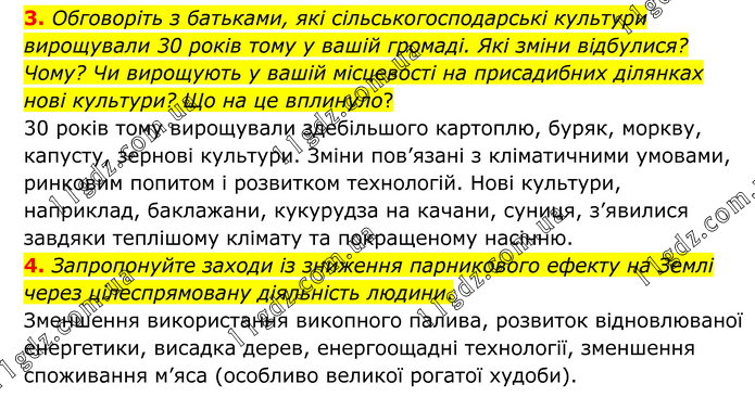 3. Обговоріть з батьками, які сільськогосподарські культури вирощували 30 років тому у вашій громаді. Які зміни відбулися? Чому? Чи вирощують у вашій місцевості на присадибних ділянках нові культури? Що на це вплинуло? 30 років тому вирощували здебільшого картоплю, буряк, моркву, капусту, зернові культури. Зміни пов’язані з кліматичними умовами, ринковим попитом і розвитком технологій. Нові культури, наприклад, баклажани, кукурудза на качани, суниця, з’явилися завдяки теплішому клімату та покращеному насінню. 4. Запропонуйте заходи із зниження парникового ефекту на Землі через цілеспрямовану діяльність людини. Зменшення використання викопного палива, розвиток відновлюваної енергетики, висадка дерев, енергоощадні технології, зменшення споживання м’яса (особливо великої рогатої худоби).