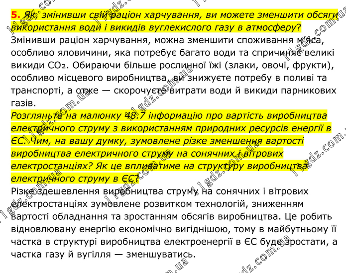 5. Як, змінивши свій раціон харчування, ви можете зменшити обсяги використання води і викидів вуглекислого газу в атмосферу? Змінивши раціон харчування, можна зменшити споживання м’яса, особливо яловичини, яка потребує багато води та спричиняє великі викиди CO₂. Обираючи більше рослинної їжі (злаки, овочі, фрукти), особливо місцевого виробництва, ви знижуєте потребу в поливі та транспорті, а отже — скорочуєте витрати води й викиди парникових газів. Розгляньте на малюнку 48.7 інформацію про вартість виробництва електричного струму з використанням природних ресурсів енергії в ЄС. Чим, на вашу думку, зумовлене різке зменшення вартості виробництва електричного струму на сонячних і вітрових електростанціях? Як це впливатиме на структуру виробництва електричного струму в ЄС? Різке здешевлення виробництва струму на сонячних і вітрових електростанціях зумовлене розвитком технологій, зниженням вартості обладнання та зростанням обсягів виробництва. Це робить відновлювану енергію економічно вигіднішою, тому в майбутньому її частка в структурі виробництва електроенергії в ЄС буде зростати, а частка газу й вугілля — зменшуватись.