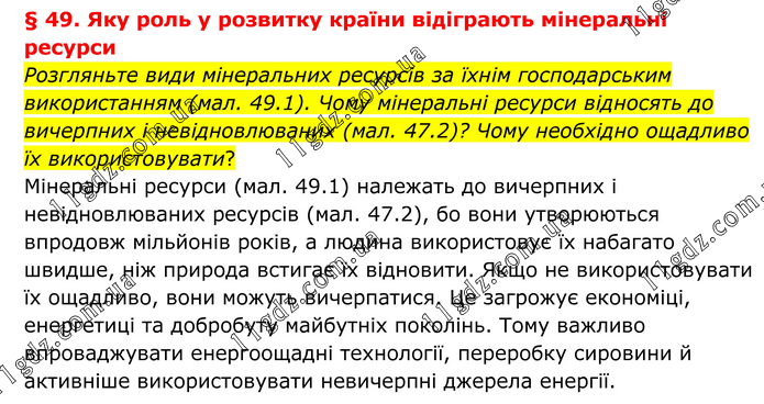 § 49. Яку роль у розвитку країни відіграють мінеральні ресурси Розгляньте види мінеральних ресурсів за їхнім господарським використанням (мал. 49.1). Чому мінеральні ресурси відносять до вичерпних і невідновлюваних (мал. 47.2)? Чому необхідно ощадливо їх використовувати? Мінеральні ресурси (мал. 49.1) належать до вичерпних і невідновлюваних ресурсів (мал. 47.2), бо вони утворюються впродовж мільйонів років, а людина використовує їх набагато швидше, ніж природа встигає їх відновити. Якщо не використовувати їх ощадливо, вони можуть вичерпатися. Це загрожує економіці, енергетиці та добробуту майбутніх поколінь. Тому важливо впроваджувати енергоощадні технології, переробку сировини й активніше використовувати невичерпні джерела енергії.