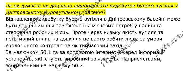 Як ви думаєте чи доцільно відновлювати видобуток бурого вугілля у Дніпровському буровугільному басейні? Відновлення видобутку бурого вугілля в Дніпровському басейні може бути доцільним для забезпечення місцевих потреб у паливі та створення робочих місць. Проте через низьку якість вугілля та негативний вплив на довкілля це варто робити лише за умови екологічного контролю та як тимчасовий захід. За малюнком 50.1 та за допомогою інтернет-джерел інформації установіть, які існують виробничі зв’язки між підприємствами, зображеними на малюнку 50.2.
