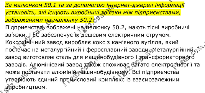 За малюнком 50.1 та за допомогою інтернет-джерел інформації установіть, які існують виробничі зв’язки між підприємствами, зображеними на малюнку 50.2. Підприємства, зображені на малюнку 50.2, мають тісні виробничі зв’язки. ГЕС забезпечує їх дешевим електричним струмом. Коксохімічний завод виробляє кокс з кам’яного вугілля, який постачає на металургійний і феросплавний заводи. Металургійний завод виготовляє сталь для машинобудівного і трансформаторного заводів. Алюмінієвий завод також споживає багато електроенергії та може постачати алюміній машинобудівному. Всі підприємства утворюють єдиний промисловий комплекс із взаємозалежним виробництвом.
