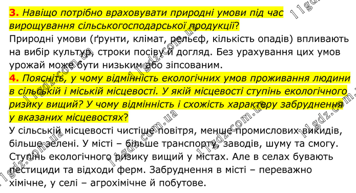 3. Навіщо потрібно враховувати природні умови під час вирощування сільськогосподарської продукції? Природні умови (ґрунти, клімат, рельєф, кількість опадів) впливають на вибір культур, строки посіву й догляд. Без урахування цих умов урожай може бути низьким або зіпсованим. 4. Поясніть, у чому відмінність екологічних умов проживання людини в сільській і міській місцевості. У якій місцевості ступінь екологічного ризику вищий? У чому відмінність і схожість характеру забруднення у вказаних місцевостях? У сільській місцевості чистіше повітря, менше промислових викидів, більше зелені. У місті – більше транспорту, заводів, шуму та смогу. Ступінь екологічного ризику вищий у містах. Але в селах бувають пестициди та відходи ферм. Забруднення в місті – переважно хімічне, у селі – агрохімічне й побутове.