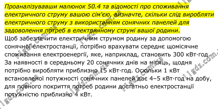 Проаналізувавши малюнок 50.4 та відомості про споживання електричного струму вашою сім'єю, визначте, скільки слід виробляти електричного струму з використанням сонячних панелей для задоволення потреб в електричному струмі вашої родини. Щоб забезпечити електричним струмом родину за допомогою сонячної електростанції, потрібно врахувати середнє щомісячне споживання електроенергії, яке, наприклад, становить 300 кВт·год. За наявності в середньому 20 сонячних днів на місяць, щодня потрібно виробляти приблизно 15 кВт·год. Оскільки 1 кВт встановленої потужності сонячних панелей дає 4–5 кВт·год на добу, для повного покриття потреб родини достатньо електростанції потужністю приблизно 4 кВт.