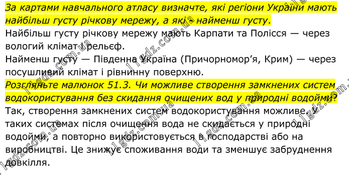 За картами навчального атласу визначте, які регіони України мають найбільш густу річкову мережу, а які - найменш густу. Найбільш густу річкову мережу мають Карпати та Полісся — через вологий клімат і рельєф. Найменш густу — Південна Україна (Причорномор’я, Крим) — через посушливий клімат і рівнинну поверхню. Розгляньте малюнок 51.3. Чи можливе створення замкнених систем водокористування без скидання очищених вод у природні водойми? Так, створення замкнених систем водокористування можливе. У таких системах після очищення вода не скидається у природні водойми, а повторно використовується в господарстві або на виробництві. Це знижує споживання води та зменшує забруднення довкілля.