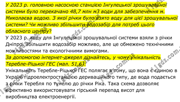 У 2023 р. головною насосною станцією Інгулецької зрошувальної системи було перекачано 48,7 млн м3 води для забезпечення м. Миколаєва водою. З якої річки було взято воду для цієї зрошувальної системи? Чи можливо збільшити водозабір для потреб цього обласного центру? У 2023 р. воду для Інгулецької зрошувальної системи взяли з річки Дніпро. Збільшити водозабір можливо, але це обмежено технічними можливостями та екологічними вимогами. За допомогою інтернет-джерел дізнайтесь, у чому унікальність Теребле-Ріцької ГЕС (мал. 51.6). Унікальність Теребле-Ріцької ГЕС полягає в тому, що вона є єдиною в Україні гідроелектростанцією дериваційного типу, де вода подається з річки Теребля по тунелю до річки Ріка. Така схема дозволяє ефективно використовувати гірський перепад висот для виробництва електроенергії.