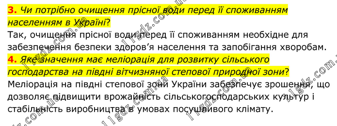 3. Чи потрібно очищення прісної води перед її споживанням населенням в Україні? Так, очищення прісної води перед її споживанням необхідне для забезпечення безпеки здоров’я населення та запобігання хворобам. 4. Яке значення має меліорація для розвитку сільського господарства на півдні вітчизняної степової природної зони? Меліорація на півдні степової зони України забезпечує зрошення, що дозволяє підвищити врожайність сільськогосподарських культур і стабільність виробництва в умовах посушливого клімату.