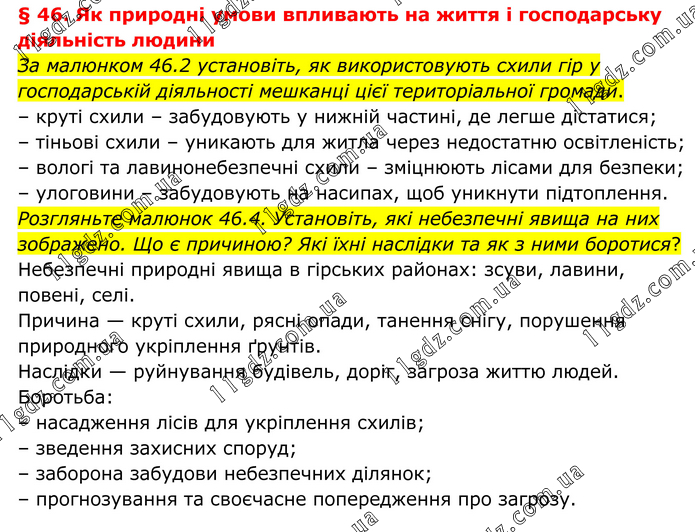 § 46. Як природні умови впливають на життя і господарську діяльність людини За малюнком 46.2 установіть, як використовують схили гір у господарській діяльності мешканці цієї територіальної громади. – круті схили – забудовують у нижній частині, де легше дістатися; – тіньові схили – уникають для житла через недостатню освітленість; – вологі та лавинонебезпечні схили – зміцнюють лісами для безпеки; – улоговини – забудовують на насипах, щоб уникнути підтоплення. Розгляньте малюнок 46.4. Установіть, які небезпечні явища на них зображено. Що є причиною? Які їхні наслідки та як з ними боротися? Небезпечні природні явища в гірських районах: зсуви, лавини, повені, селі. Причина — круті схили, рясні опади, танення снігу, порушення природного укріплення ґрунтів. Наслідки — руйнування будівель, доріг, загроза життю людей. Боротьба: – насадження лісів для укріплення схилів; – зведення захисних споруд; – заборона забудови небезпечних ділянок; – прогнозування та своєчасне попередження про загрозу.