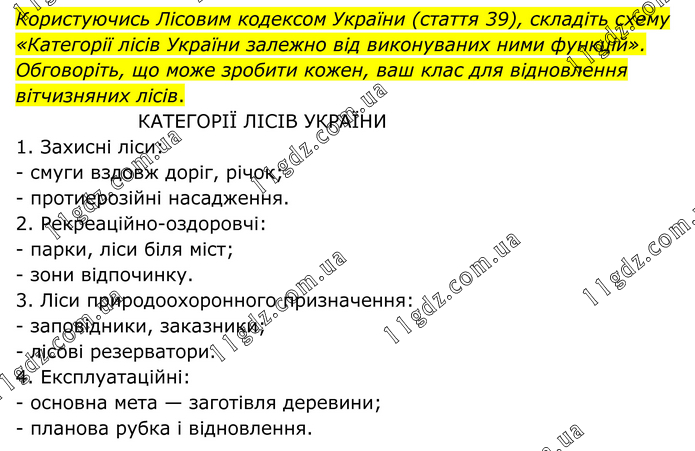 Користуючись Лісовим кодексом України (стаття 39), складіть схему «Категорії лісів України залежно від виконуваних ними функцій». Обговоріть, що може зробити кожен, ваш клас для відновлення вітчизняних лісів. КАТЕГОРІЇ ЛІСІВ УКРАЇНИ 1. Захисні ліси: - смуги вздовж доріг, річок; - протиерозійні насадження. 2. Рекреаційно-оздоровчі: - парки, ліси біля міст; - зони відпочинку. 3. Ліси природоохоронного призначення: - заповідники, заказники; - лісові резерватори. 4. Експлуатаційні: - основна мета — заготівля деревини; - планова рубка і відновлення.
