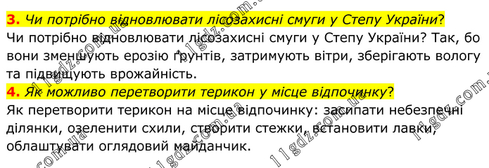 3. Чи потрібно відновлювати лісозахисні смуги у Степу України? Чи потрібно відновлювати лісозахисні смуги у Степу України? Так, бо вони зменшують ерозію ґрунтів, затримують вітри, зберігають вологу та підвищують врожайність. 4. Як можливо перетворити терикон у місце відпочинку? Як перетворити терикон на місце відпочинку: засипати небезпечні ділянки, озеленити схили, створити стежки, встановити лавки, облаштувати оглядовий майданчик.