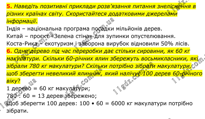 5. Наведіть позитивні приклади розв’язання питання знеліснення в різних країнах світу. Скористайтеся додатковими джерелами інформації. Індія – національна програма посадки мільйонів дерев. Китай – проєкт «Зелена стіна» для зупинки опустелювання. Коста-Рика – екотуризм і заборона вирубок відновили 50% лісів. 6. Одне дерево під час переробки дає стільки сировини, як 60 кг макулатури. Скільки 60-річних ялин збережуть восьмикласники, які зібрали 780 кг макулатури? Скільки потрібно зібрати макулатури, щоб зберегти невеликий ялинник, який налічує 100 дерев 60-річного віку? 1 дерево = 60 кг макулатури; 780 : 60 = 13 дерев збережено; Щоб зберегти 100 дерев: 100 • 60 = 6000 кг макулатури потрібно зібрати.