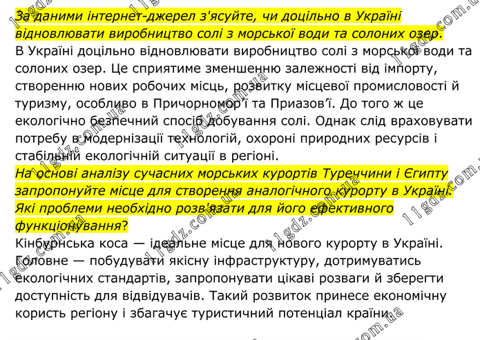За даними інтернет-джерел з'ясуйте, чи доцільно в Україні відновлювати виробництво солі з морської води та солоних озер. В Україні доцільно відновлювати виробництво солі з морської води та солоних озер. Це сприятиме зменшенню залежності від імпорту, створенню нових робочих місць, розвитку місцевої промисловості й туризму, особливо в Причорномор’ї та Приазов’ї. До того ж це екологічно безпечний спосіб добування солі. Однак слід враховувати потребу в модернізації технологій, охороні природних ресурсів і стабільній екологічній ситуації в регіоні. На основі аналізу сучасних морських курортів Туреччини і Єгипту запропонуйте місце для створення аналогічного курорту в Україні. Які проблеми необхідно розв'язати для його ефективного функціонування? Кінбурнська коса — ідеальне місце для нового курорту в Україні. Головне — побудувати якісну інфраструктуру, дотримуватись екологічних стандартів, запропонувати цікаві розваги й зберегти доступність для відвідувачів. Такий розвиток принесе економічну користь регіону і збагачує туристичний потенціал країни.