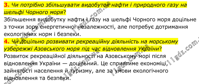 3. Чи потрібно збільшувати видобуток нафти і природного газу на шельфі Чорного моря? Збільшення видобутку нафти і газу на шельфі Чорного моря доцільне з точки зору енергетичної незалежності, але потребує дотримання екологічних норм і безпеки. 4. Чи доцільно розвивати рекреаційну діяльність на морському узбережжі Азовського моря під час відновлення України? Розвиток рекреаційної діяльності на Азовському морі після відновлення України — доцільний. Це сприятиме економіці, зайнятості населення й туризму, але за умови екологічного відновлення та безпеки.