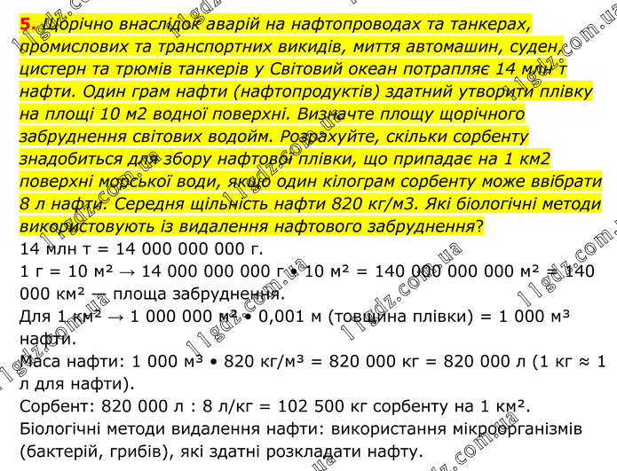 5. Щорічно внаслідок аварій на нафтопроводах та танкерах, промислових та транспортних викидів, миття автомашин, суден, цистерн та трюмів танкерів у Світовий океан потрапляє 14 млн т нафти. Один грам нафти (нафтопродуктів) здатний утворити плівку на площі 10 м2 водної поверхні. Визначте площу щорічного забруднення світових водойм. Розрахуйте, скільки сорбенту знадобиться для збору нафтової плівки, що припадає на 1 км2 поверхні морської води, якщо один кілограм сорбенту може ввібрати 8 л нафти. Середня щільність нафти 820 кг/м3. Які біологічні методи використовують із видалення нафтового забруднення? 14 млн т = 14 000 000 000 г. 1 г = 10 м² → 14 000 000 000 г • 10 м² = 140 000 000 000 м² = 140 000 км² — площа забруднення. Для 1 км² → 1 000 000 м² • 0,001 м (товщина плівки) = 1 000 м³ нафти. Маса нафти: 1 000 м³ • 820 кг/м³ = 820 000 кг = 820 000 л (1 кг ≈ 1 л для нафти). Сорбент: 820 000 л : 8 л/кг = 102 500 кг сорбенту на 1 км². Біологічні методи видалення нафти: використання мікроорганізмів (бактерій, грибів), які здатні розкладати нафту.