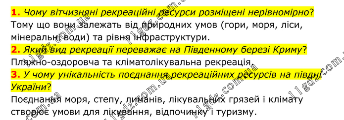 1. Чому вітчизняні рекреаційні ресурси розміщені нерівномірно? Тому що вони залежать від природних умов (гори, моря, ліси, мінеральні води) та рівня інфраструктури. 2. Який вид рекреації переважає на Південному березі Криму? Пляжно-оздоровча та кліматолікувальна рекреація. 3. У чому унікальність поєднання рекреаційних ресурсів на півдні України? Поєднання моря, степу, лиманів, лікувальних грязей і клімату створює умови для лікування, відпочинку і туризму.