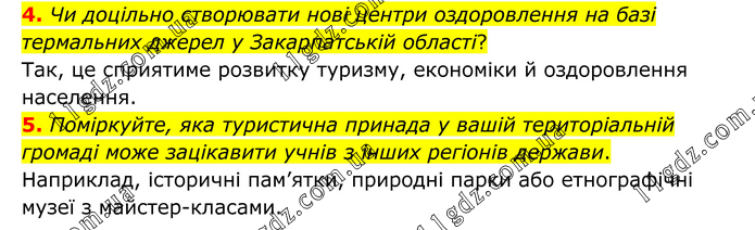 4. Чи доцільно створювати нові центри оздоровлення на базі термальних джерел у Закарпатській області? Так, це сприятиме розвитку туризму, економіки й оздоровлення населення. 5. Поміркуйте, яка туристична принада у вашій територіальній громаді може зацікавити учнів з інших регіонів держави. Наприклад, історичні пам’ятки, природні парки або етнографічні музеї з майстер-класами.