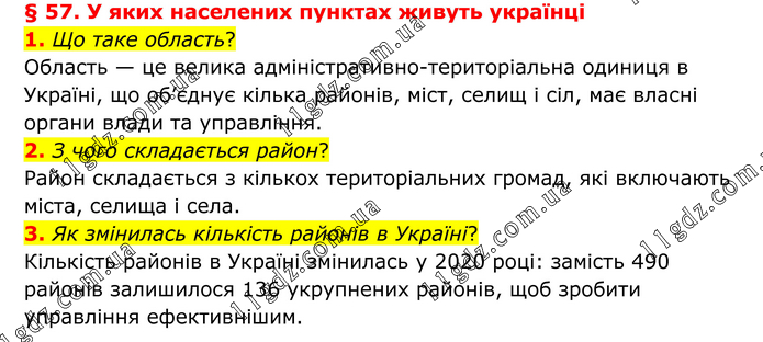 § 57. У яких населених пунктах живуть українці 1. Що таке область? Область — це велика адміністративно-територіальна одиниця в Україні, що об’єднує кілька районів, міст, селищ і сіл, має власні органи влади та управління. 2. З чого складається район? Район складається з кількох територіальних громад, які включають міста, селища і села. 3. Як змінилась кількість районів в Україні? Кількість районів в Україні змінилась у 2020 році: замість 490 районів залишилося 136 укрупнених районів, щоб зробити управління ефективнішим.