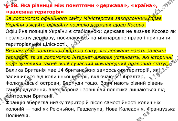 § 58. Яка різниця між поняттями «держава», «країна», «залежна територія» За допомогою офіційного сайту Міністерства закордонних справ України з'ясуйте офіційну позицію держави щодо Косово. Офіційна позиція України є стабільною: держава не визнає Косово як незалежну державу, посилаючись на міжнародне право і принципи територіальної цілісності. Визначте за політичною картою світу, які держави мають залежні території, та за допомогою інтернет-джерел установіть, які історичні події зумовили такий їхній сучасний міжнародний правовий статус. Велика Британія має 14 британських заморських територій, які залишилися від колишньої імперії, включаючи Гібралтар, Фолклендські острови, Бермуди тощо. Вони мають різний рівень самоврядування, але оборона і зовнішня політика лишаються під контролем Британії. Франція зберегла низку територій після самостійності колишніх колоній — такі як Реюньйон, Гваделупа, Нова Каледонія, Французька Полінезія.
