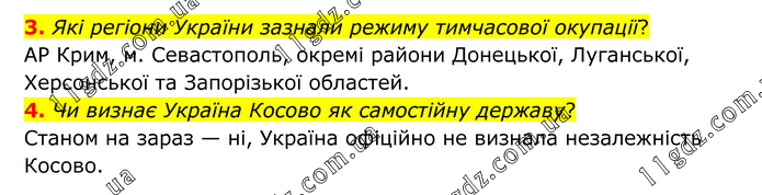 3. Які регіони України зазнали режиму тимчасової окупації? АР Крим, м. Севастополь, окремі райони Донецької, Луганської, Херсонської та Запорізької областей. 4. Чи визнає Україна Косово як самостійну державу? Станом на зараз — ні, Україна офіційно не визнала незалежність Косово.