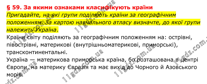 § 59. За якими ознаками класифікують країни Пригадайте, на які групи поділяють країни за географічним положенням. За картою навчального атласу визначте, до якої групи належить Україна. Країни світу поділяють за географічним положенням на: острівні, півострівні, материкові (внутрішньоматерикові, приморські), трансконтинентальні. Україна — материкова приморська країна, бо розташована в центрі Європи, на материку Євразія та має вихід до Чорного й Азовського морів.