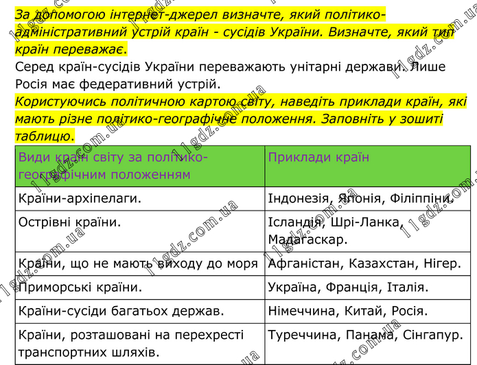 За допомогою інтернет-джерел визначте, який політико-адміністративний устрій країн - сусідів України. Визначте, який тип країн переважає. Серед країн-сусідів України переважають унітарні держави. Лише Росія має федеративний устрій. Користуючись політичною картою світу, наведіть приклади країн, які мають різне політико-географічне положення. Заповніть у зошиті таблицю.