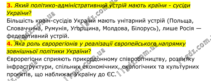 3. Який політико-адміністративний устрій мають країни - сусіди України? Більшість країн-сусідів України мають унітарний устрій (Польща, Словаччина, Румунія, Угорщина, Молдова, Білорусь), лише Росія — федеративний устрій. 4. Яка роль єврорегіонів у реалізації європейського напрямку зовнішньої політики України? Єврорегіони сприяють прикордонному співробітництву, розвитку інфраструктури, спільних економічних, екологічних та культурних проєктів, що наближає Україну до ЄС.