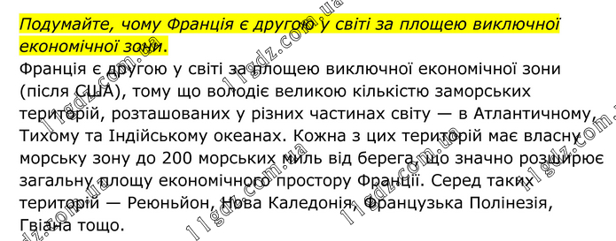 Подумайте, чому Франція є другою у світі за площею виключної економічної зони. Франція є другою у світі за площею виключної економічної зони (після США), тому що володіє великою кількістю заморських територій, розташованих у різних частинах світу — в Атлантичному, Тихому та Індійському океанах. Кожна з цих територій має власну морську зону до 200 морських миль від берега, що значно розширює загальну площу економічного простору Франції. Серед таких територій — Реюньйон, Нова Каледонія, Французька Полінезія, Гвіана тощо.