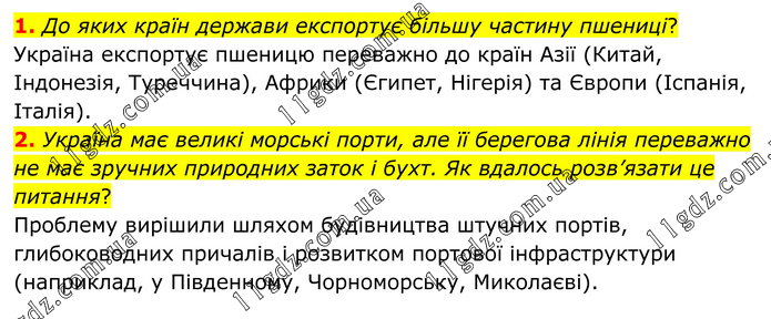 1. До яких країн держави експортує більшу частину пшениці? Україна експортує пшеницю переважно до країн Азії (Китай, Індонезія, Туреччина), Африки (Єгипет, Нігерія) та Європи (Іспанія, Італія). 2. Україна має великі морські порти, але її берегова лінія переважно не має зручних природних заток і бухт. Як вдалось розв’язати це питання? Проблему вирішили шляхом будівництва штучних портів, глибоководних причалів і розвитком портової інфраструктури (наприклад, у Південному, Чорноморську, Миколаєві).