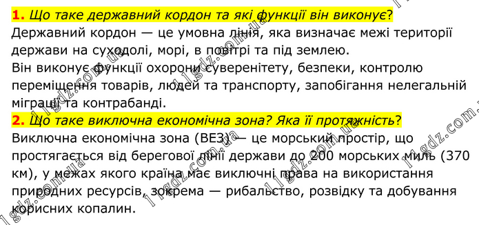 1. Що таке державний кордон та які функції він виконує? Державний кордон — це умовна лінія, яка визначає межі території держави на суходолі, морі, в повітрі та під землею. Він виконує функції охорони суверенітету, безпеки, контролю переміщення товарів, людей та транспорту, запобігання нелегальній міграції та контрабанді. 2. Що таке виключна економічна зона? Яка її протяжність? Виключна економічна зона (ВЕЗ) — це морський простір, що простягається від берегової лінії держави до 200 морських миль (370 км), у межах якого країна має виключні права на використання природних ресурсів, зокрема — рибальство, розвідку та добування корисних копалин.
