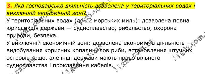 3. Яка господарська діяльність дозволена у територіальних водах і виключній економічній зоні? У територіальних водах (до 12 морських миль): дозволена повна юрисдикція держави — судноплавство, рибальство, охорона природи, безпека. У виключній економічній зоні: дозволена економічна діяльність — видобування корисних копалин, лов риби, встановлення штучних островів тощо, але інші держави мають право вільного судноплавства і прокладання кабелів.
