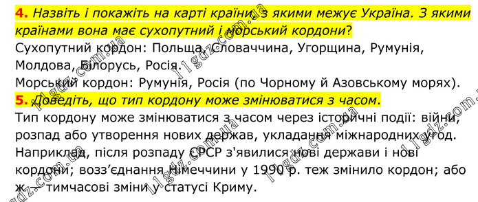 4. Назвіть і покажіть на карті країни, з якими межує Україна. З якими країнами вона має сухопутний і морський кордони? Сухопутний кордон: Польща, Словаччина, Угорщина, Румунія, Молдова, Білорусь, Росія. Морський кордон: Румунія, Росія (по Чорному й Азовському морях). 5. Доведіть, що тип кордону може змінюватися з часом. Тип кордону може змінюватися з часом через історичні події: війни, розпад або утворення нових держав, укладання міжнародних угод. Наприклад, після розпаду СРСР з'явилися нові держави і нові кордони; возз’єднання Німеччини у 1990 р. теж змінило кордон; або ж — тимчасові зміни у статусі Криму.