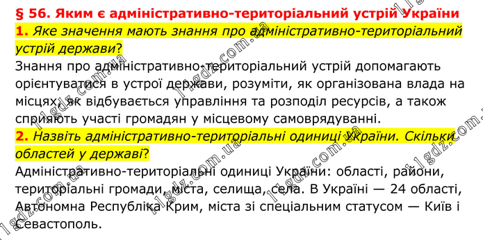 § 56. Яким є адміністративно-територіальний устрій України 1. Яке значення мають знання про адміністративно-територіальний устрій держави? Знання про адміністративно-територіальний устрій допомагають орієнтуватися в устрої держави, розуміти, як організована влада на місцях, як відбувається управління та розподіл ресурсів, а також сприяють участі громадян у місцевому самоврядуванні. 2. Назвіть адміністративно-територіальні одиниці України. Скільки областей у державі? Адміністративно-територіальні одиниці України: області, райони, територіальні громади, міста, селища, села. В Україні — 24 області, Автономна Республіка Крим, міста зі спеціальним статусом — Київ і Севастополь.