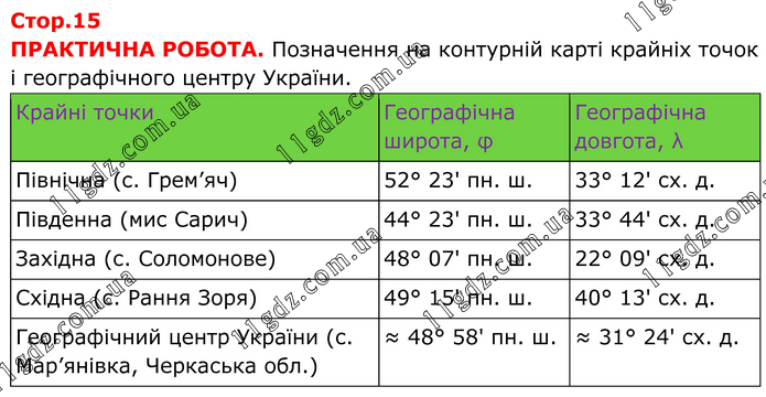 ПРАКТИЧНА РОБОТА. Позначення на контурній карті крайніх точок і географічного центру України. Крайні точки Географічна широта, φ Географічна довгота, λ Північна (с. Грем’яч) 52° 23' пн. ш. 33° 12' сх. д. Південна (мис Сарич) 44° 23' пн. ш. 33° 44' сх. д. Західна (с. Соломонове) 48° 07' пн. ш. 22° 09' сх. д. Східна (с. Рання Зоря) 49° 15' пн. ш. 40° 13' сх. д. Географічний центр України (с. Мар’янівка, Черкаська обл.) ≈ 48° 58' пн. ш. ≈ 31° 24' сх. д.