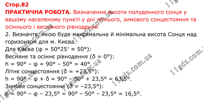 ПРАКТИЧНА РОБОТА. Визначення висоти полуденного сонця у вашому населеному пункті у дні літнього, зимового сонцестояння та осіннього і весняного рівнодення 2. Визначте, якою буде максимальна й мінімальна висота Сонця над горизонтом для м. Києва. Для Києва (φ = 50°25′ ≈ 50°): Весняне та осіннє рівнодення (δ = 0°): h = 90° – φ = 90° – 50° = 40°. Літнє сонцестояння (δ = +23,5°): h = 90° – φ + δ = 90° – 50° + 23,5° = 63,5°. Зимове сонцестояння (δ = –23,5°): h = 90° – φ – 23,5° = 90° – 50° – 23,5° = 16,5°.