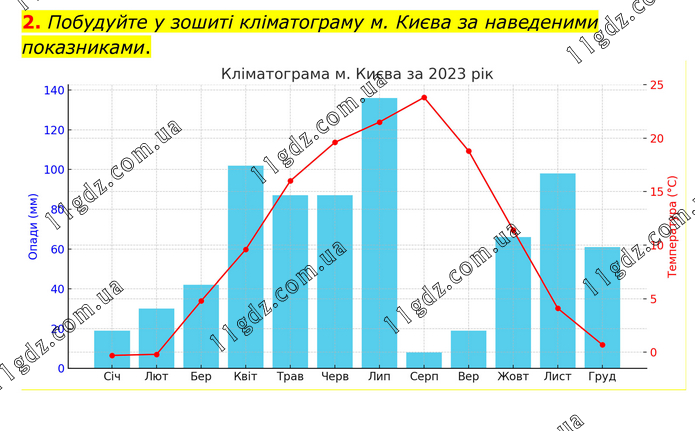 Побудуйте у зошиті кліматограму м. Києва за наведеними показниками.