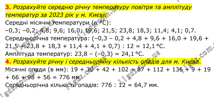 3. Розрахуйте середню річну температуру повітря та амплітуду температур за 2023 рік у м. Києві. Середні місячні температури (в °C): –0,3; –0,2; 4,8; 9,6; 16,0; 19,6; 21,5; 23,8; 18,3; 11,4; 4,1; 0,7. Середньорічна температура: (–0,3 – 0,2 + 4,8 + 9,6 + 16,0 + 19,6 + 21,5 + 23,8 + 18,3 + 11,4 + 4,1 + 0,7) : 12 = 12,1 °C. Амплітуда температур: 23,8 – (–0,3) = 24,1 °C. 4. Розрахуйте річну і середньорічну кількість опадів для м. Києва. Місячні опади (в мм): 19 + 30 + 42 + 102 + 87 + 112 + 136 + 9 + 19 + 66 + 98 + 56 = 776 мм. Середньорічна кількість опадів: 776 : 12 = 64,7 мм.