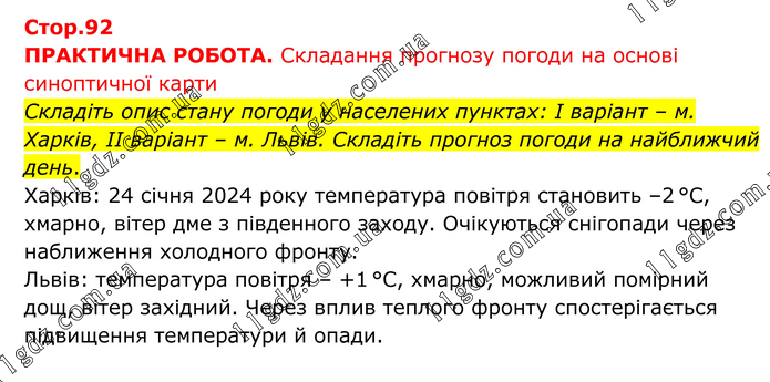 ПРАКТИЧНА РОБОТА. Складання прогнозу погоди на основі синоптичної карти Складіть опис стану погоди у населених пунктах: І варіант – м. Харків, ІІ варіант – м. Львів. Складіть прогноз погоди на найближчий день. Харків: 24 січня 2024 року температура повітря становить –2 °C, хмарно, вітер дме з південного заходу. Очікуються снігопади через наближення холодного фронту. Львів: температура повітря – +1 °C, хмарно, можливий помірний дощ, вітер західний. Через вплив теплого фронту спостерігається підвищення температури й опади.