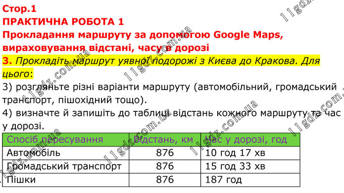 ПРАКТИЧНА РОБОТА 1 Прокладання маршруту за допомогою Google Maps, вираховування відстані, часу в дорозі 3. Прокладіть маршрут уявної подорожі з Києва до Кракова. Для цього: 3) розгляньте різні варіанти маршруту (автомобільний, громадський транспорт, пішохідний тощо). 4) визначте й запишіть до таблиці відстань кожного маршруту та час у дорозі.