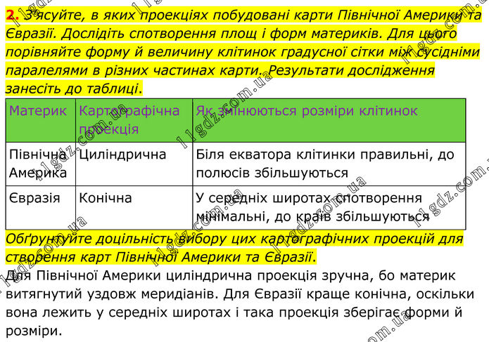 2. З’ясуйте, в яких проекціях побудовані карти Північної Америки та Євразії. Дослідіть спотворення площ і форм материків. Для цього порівняйте форму й величину клітинок градусної сітки між сусідніми паралелями в різних частинах карти. Результати дослідження занесіть до таблиці. Материк Картографічна проекція Як змінюються розміри клітинок Північна Америка Циліндрична Біля екватора клітинки правильні, до полюсів збільшуються Євразія Конічна У середніх широтах спотворення мінімальні, до країв збільшуються Обґрунтуйте доцільність вибору цих картографічних проекцій для створення карт Північної Америки та Євразії. Для Північної Америки циліндрична проекція зручна, бо материк витягнутий уздовж меридіанів. Для Євразії краще конічна, оскільки вона лежить у середніх широтах і така проекція зберігає форми й розміри.