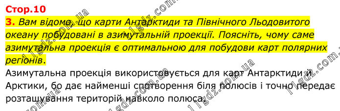 3. Вам відомо, що карти Антарктиди та Північного Льодовитого океану побудовані в азимутальній проекції. Поясніть, чому саме азимутальна проекція є оптимальною для побудови карт полярних регіонів. Азимутальна проекція використовується для карт Антарктиди й Арктики, бо дає найменші спотворення біля полюсів і точно передає розташування територій навколо полюса.