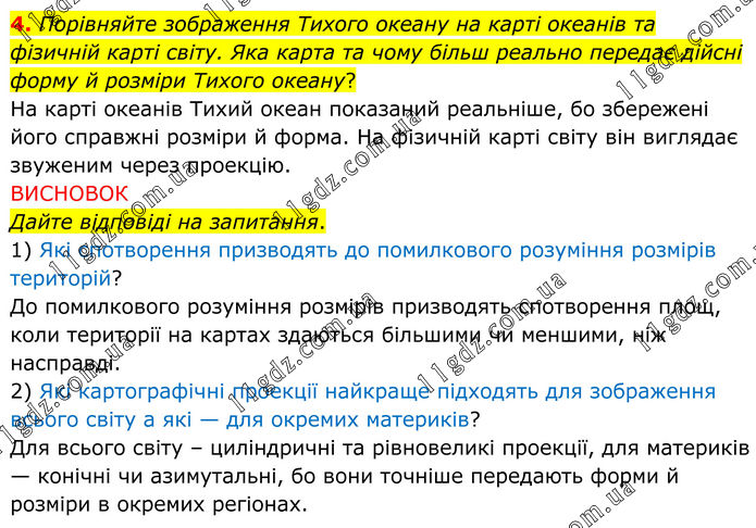 4. Порівняйте зображення Тихого океану на карті океанів та фізичній карті світу. Яка карта та чому більш реально передає дійсні форму й розміри Тихого океану? На карті океанів Тихий океан показаний реальніше, бо збережені його справжні розміри й форма. На фізичній карті світу він виглядає звуженим через проекцію. ВИСНОВОК Дайте відповіді на запитання. 1) Які спотворення призводять до помилкового розуміння розмірів територій? До помилкового розуміння розмірів призводять спотворення площ, коли території на картах здаються більшими чи меншими, ніж насправді. 2) Які картографічні проекції найкраще підходять для зображення всього світу а які — для окремих материків? Для всього світу – циліндричні та рівновеликі проекції, для материків — конічні чи азимутальні, бо вони точніше передають форми й розміри в окремих регіонах.