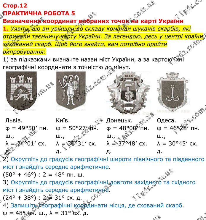 ПРАКТИЧНА РОБОТА 5 Визначення координат вибраних точок на карті України 1. Уявіть, що ви увійшли до складу команди шукачів скарбів, які отримали таємничу карту України. За легендою, десь у центрі країни захований скарб. Щоб його знайти, вам потрібно пройти випробування: 1) за підказками визначте назви міст України, а за картою їхні географічні координати з точністю до мінут. Львів. φ = 49°50′ пн. ш., λ = 24°01′ сх. д. Київ. φ = 50°27′ пн. ш., λ = 30°31′ сх. д. Донецьк. φ = 48°00′ пн. ш., λ = 37°48′ сх. д. Одеса. φ = 46°28′ пн. ш., λ = 30°45′ сх. д. 2) Округліть до градусів географічні широти північного та південного міст і знайдіть середнє арифметичне. (50° + 46°) : 2 = 48° пн. ш. 3) Округліть до градусів географічні довготи західного та східного міст і знайдіть середнє арифметичне. (24° + 38°) : 2 = 31° сх. д. 4) Запишіть географічні координати місця, де схований скарб. φ = 48° пн. ш., λ = 31° сх. д.