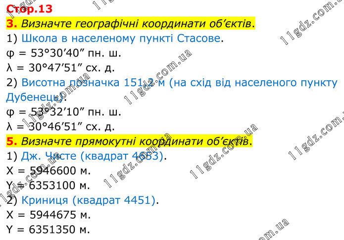 3. Визначте географічні координати об’єктів. 1) Школа в населеному пункті Стасове. φ = 53°30’40” пн. ш. λ = 30°47’51” сх. д. 2) Висотна позначка 151,2 м (на схід від населеного пункту Дубенець). φ = 53°32’10” пн. ш. λ = 30°46’51” сх. д. 5. Визначте прямокутні координати об’єктів. 1) Дж. Чисте (квадрат 4653). X = 5946600 м. Y = 6353100 м. 2) Криниця (квадрат 4451). X = 5944675 м. Y = 6351350 м.