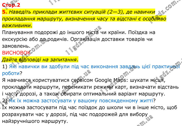 5. Наведіть приклади життєвих ситуацій (2—3), де навички прокладання маршруту, визначення часу та відстані є особливо важливими. Планування подорожі до іншого міста чи країни. Поїздка на екскурсію або до родичів. Організація доставки товарів чи замовлень. ВИСНОВОК Дайте відповіді на запитання. 1) Які навички ви здобули під час виконання завдань цієї практичної роботи? Я навчився користуватися сервісом Google Maps: шукати місця, прокладати маршрути, перемикати режими карт, визначати відстань і час у дорозі, а також обирати оптимальний варіант маршруту. 2) Як їх можна застосувати у вашому повсякденному житті? Їх можна застосувати під час поїздок до школи чи в інше місто, щоб розрахувати час у дорозі, під час подорожей для вибору найзручнішого маршруту.