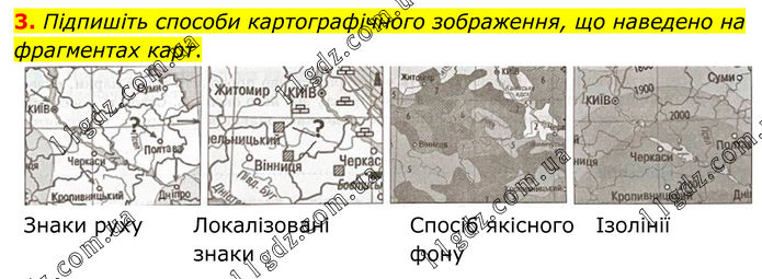 3. Підпишіть способи картографічного зображення, що наведено на фрагментах карт. Знаки руху Локалізовані знаки Спосіб якісного фону Ізолінії