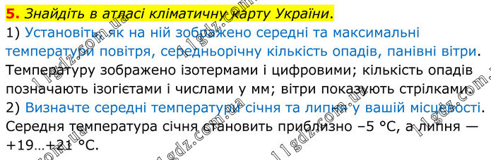 5. Знайдіть в атласі кліматичну карту України. 1) Установіть, як на ній зображено середні та максимальні температури повітря, середньорічну кількість опадів, панівні вітри. Температуру зображено ізотермами і цифровими; кількість опадів позначають ізогієтами і числами у мм; вітри показують стрілками. 2) Визначте середні температури січня та липня у вашій місцевості. Середня температура січня становить приблизно –5 °C, а липня — +19…+21 °C.