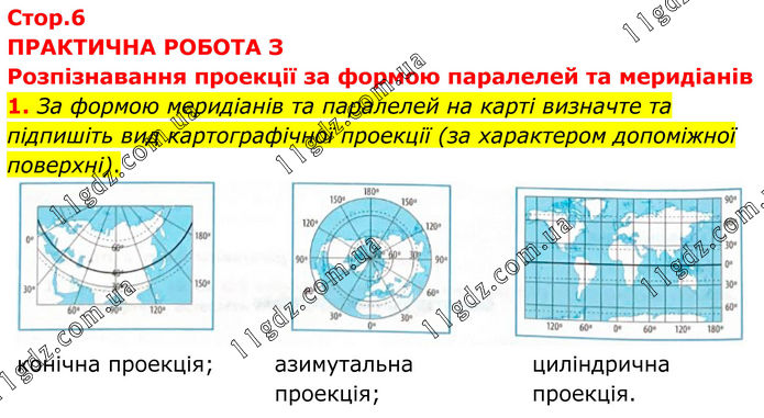 ПРАКТИЧНА РОБОТА З Розпізнавання проекції за формою паралелей та меридіанів 1. За формою меридіанів та паралелей на карті визначте та підпишіть вид картографічної проекції (за характером допоміжної поверхні). конічна проекція; азимутальна проекція; циліндрична проекція.
